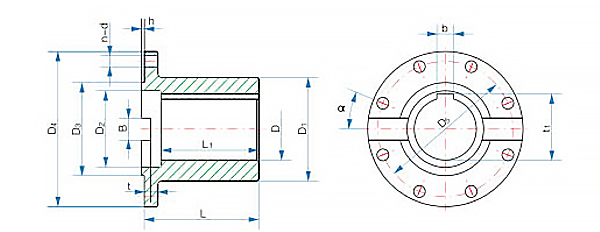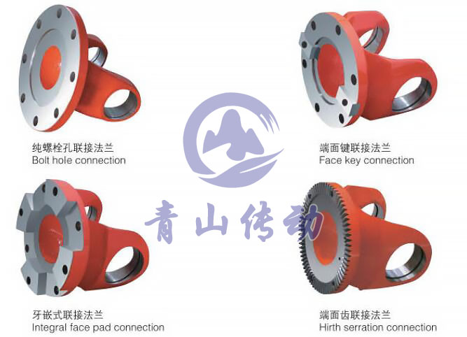 萬向聯軸器一般是通過兩端外側叉頭的法蘭與配套法蘭軸套的法蘭相聯。叉頭的法蘭有下圖所示四種結構型式,分別為純螺栓孔連接法蘭、端面鍵聯接法蘭、牙嵌式聯接法蘭和端面齒聯接法蘭。